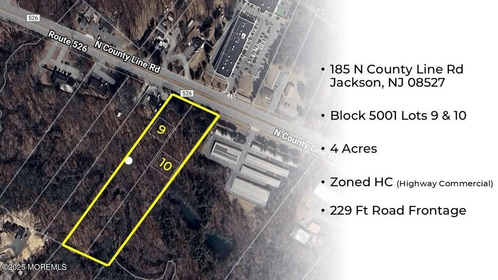 Seize the chance to own a 4-acre double lot (Block 5001, Lots 9 and 10) strategically located at 185 N County Line Rd, Jackson, NJ in the heart of a thriving commercial corridor. Zoned HC (Highway Commercial), this expansive property offers unparalleled potential for a wide range of business ventures, making it an ideal investment for developers, entrepreneurs, and investors alike. This prime commercial lot is perfectly positioned to capitalize on Jackson's economic growth and increasing demand for commercial services. Whether you're envisioning a retail plaza, professional offices, or a high-traffic restaurant, this property offers the space, zoning, and location to bring your vision to life. Don't miss this rare opportunity to secure a substantial parcel in a high-demand area. Endless Possibilities.