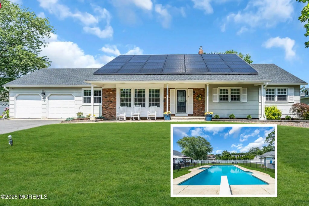 Spacious 5 BR, 3 Full Bathroom home in desired Candlewood neighborhood! Home features many updates including 2 Primary Suites with ensuite (one upstairs with separate sitting area, one downstairs). Stunning eat-in kitchen with granite counters and stainless appliances. Dining room features wood burning fireplace, offering cozy atmosphere. The finished basement adds even more room. Outside, enjoy your own private retreat with a heated in-ground pool, spa, patio, and beautifully landscaped, fenced-in yard and pool. Home has solar panels. Large 2-car garage. Separate laundry room with a private entry. Close to shopping, schools, highways and shore.